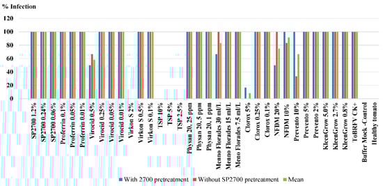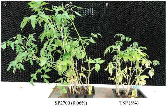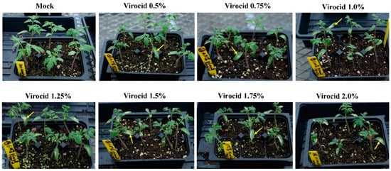 We were also interested in determining whether any of these chemicals could be useful as a disinfectant for direct application on plants. Using tomato plants pretreated with or without SP2700, a bioformulation which induces systemic acquired resistance (SAR) against tobacco mosaic virus [45,46,47], we aimed to evaluate the efficacy of disinfectants against ToBRFV infectivity through bioassays.