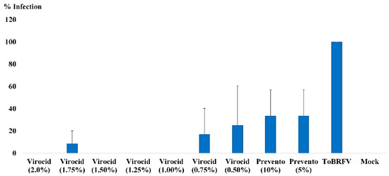Average percent infections and standard deviations on test plants used for bioassays to assess efficacy of different concentrations of Virocid in a serial dilution (0.5% to 2%) against ToBRFV infectivity in two separate experiments. In addition, Prevento in 5% and 10% was also included in the test to show some partial effects against ToBRFV infectivity, whereas the positive control (ToBRFV) showed 100% infection and the Mock treatment with inoculation buffer had no infection.