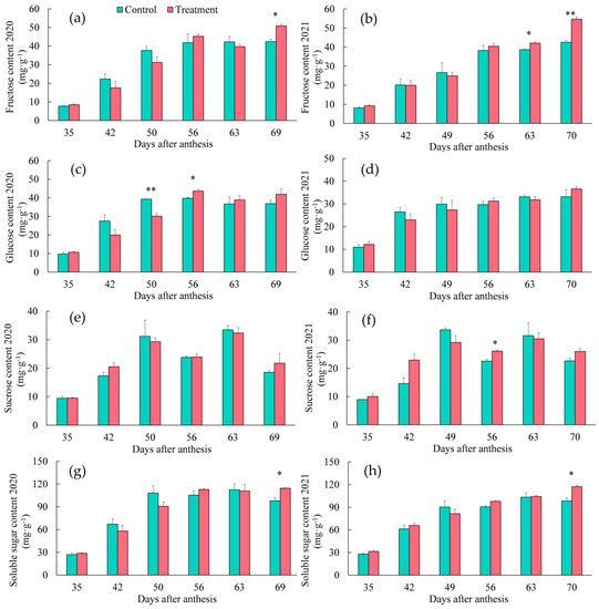 Dynamic changes in sugar contents in ‘Feizixiao’ litchi pulp between the treated and control group in 2020 and 2021: (a,b) fructose; (c,d) glucose; (e,f) sucrose; (g,h) soluble sugar. ** indicates a significant difference at the p < 0.01 level, * indicates a significant difference at the p < 0.05 level. Error bars are expressed as standard errors.