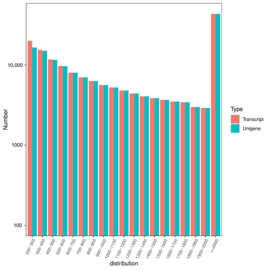 A total of 165,886 transcripts were assembled, and 161,697 unigenes were obtained by transcriptome sequencing. The length distribution is shown in Figure 2, with an average length of 1471 bp and 1502 bp.