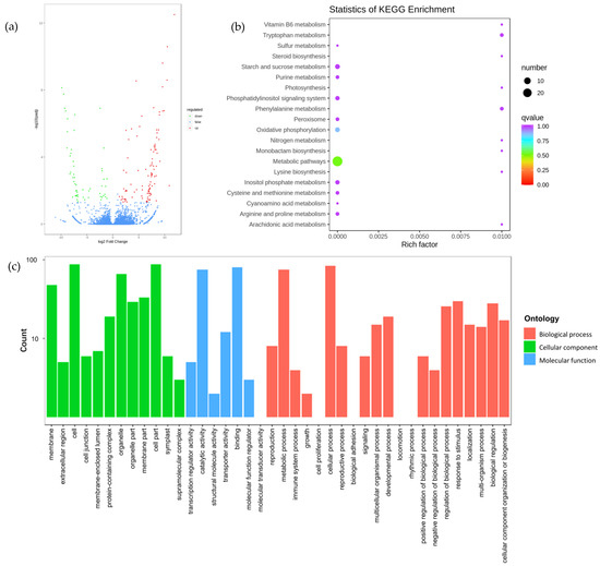 Volcano diagram, KEGG, and GO enrichment analysis diagram of differentially expressed genes in ‘Feizixiao’ litchi pulp obtained by comparing the treated and control groups at 69 DAA in 2020: (a) Volcano diagram; (b,c) KEGG and GO enrichment analysis diagram.