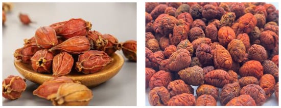 Dried gardenia (left side) and peeled dried fruits (right side).