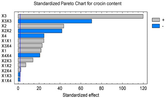 The Pareto plot in Figure 2 showed the percentage of gardenia fruit used and its quadratic interaction strongly affecting the crocin content with the large bar. The other variables appeared to have effect on crocin in this experiment, except X1X3 and X1X4. These results again confirmed all independent variables have more significant effect on crocin content in extraction.