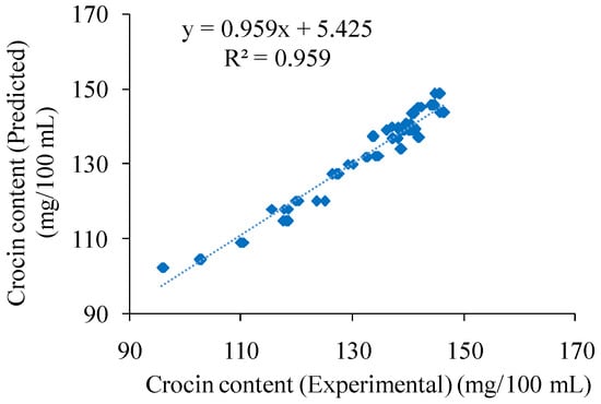 Correlation between the experimental and the predicted crocin content using the model described in Equation (3).