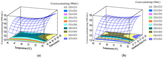 Extraction time has a great influence on extraction efficiency, since crocin content increases with increasing extraction time. However, when the time is too long, the extraction efficiency will not increase but decrease. This can be explained by Fick’s second law of diffusion: as extraction time increases, the content of substances in the material diffuses from the cell to the outside [24]. However, the extraction efficiency will not increase after a certain period of time. This time period depends on other extraction conditions such as solvent, extraction temperature, and the ratio of solvent material, as well as the nature of the material and compound to be extracted [25]. At the same time, when the extraction time is prolonged, the biological compounds inside and outside the material are close to reaching equilibrium, so the obtained extract has a slow increase in crocin content later on. In addition, these compounds can be oxidized by adverse environmental factors (temperature, light, and oxygen) [26].