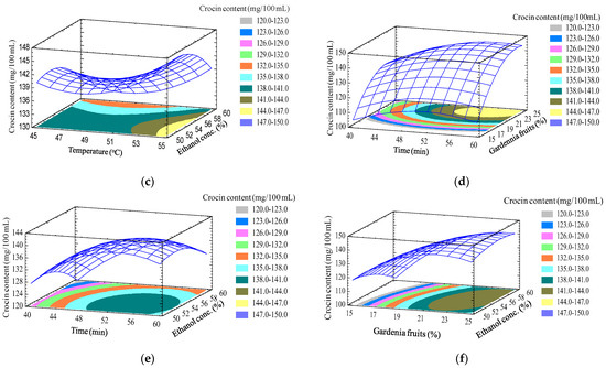 The selection of the appropriate solvent is an important step in the extraction because it directly affects the extraction efficiency [21]. Many previous studies have shown that ethanol has the ability to promote rapid diffusion thanks to its polar properties in the molecular structure, which helps to thoroughly extract components and has anti-inflammatory activity [27]. At the same time, a number of studies have also shown that ethanol is likely to be an optimal solvent for extraction due to its safety in human health and environmental friendliness [28]. With the results obtained from this experiment, the optimal ethanol concentration for the extraction of crocin from gardenia fruit was 56%. Because the structure of crocin consists of two parts, the hydrophilic glycosyl radical and the hydrophobic polyene of crocetin acid, it is soluble in solvents including water and ethanol. If the amount of water is large, the hydrophobic part is difficult to dissolve; if the amount of ethanol is high, the hydrophilic part is difficult to dissolve [29]. In addition, extraction of metabolites by using an ethanol–water solvent was simple and cost effective, which could be applied in various scales of industry [30]. Sharmila et al. [31] also reported that organic solvents combined with water can create optimal conditions for the extraction of natural color compounds. The studies of Yilmaz et al. [32] also showed that the appropriate concentration of ethanol for extraction of natural color compounds is usually in the range of 50% to 80%. Therefore, ethanol with 56% concentration was selected for the extraction of crocin from gardenia fruit.