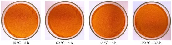The content of crocin and water, together with measured water activity, is shown in Table 4. The effects of foam-mat drying temperature and time on the color of gardenia powder are presented in Figure 5. Drying air temperature greatly affects the drying process of the sponge; too low or too high temperature is detrimental to the crocin content in gardenia powder.