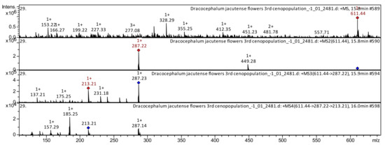The [M + H]+ ion produced four fragment ion at m/z 287, m/z 595, m/z 535, and m/z 491 (Figure 5). The fragment ion with m/z 287 yields three daughter ions at m/z 259, m/z 213, and m/z 147. The fragment ion with m/z 213 yields one daughter ion at m/z 185. It was identified in the bibliography in extracts of Perilla frutescens [20,21].