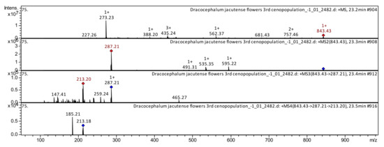 All the identified compounds, along with molecular formulas, MS/MS data, and their comparative profile for D. jacutense, are summarized in Table A1 (Appendix A). A total of 105 polyphenolic compounds and 51 compounds of other chemical groups were identified in extracts of wild D. jacutense and introduced D. jacutense, respectively, a total of 156 compounds. Of these, polyphenols in wild plant extracts are 70.2% (91 compounds), and in introduced plant extracts—65% (52 compounds). For example: some newly annotated polyphenols from the genus Dracocephalum are described below. The flavonol isorhamnetin was found in extracts from the leaves and flowers of D. jacutense. The CID-spectrum (collision-induced dissociation spectrum) in negative ion modes of isorhamnetin from extracts of D. jacutense is shown in Figure 3.