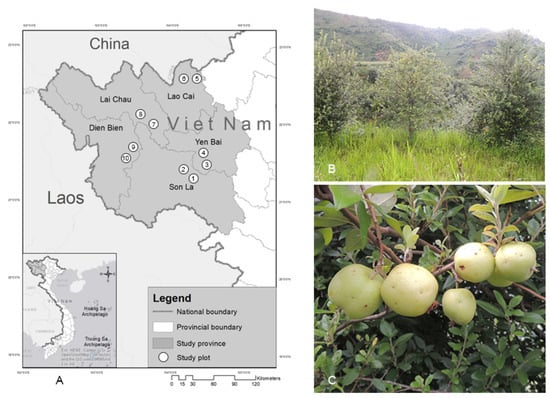 Geographic location of Docynia indica orchards found to be infested with Bacchisa medioviolacea in northwest Vietnam (A), D. indica orchard (B) in Yen Bai province, and fruit (C). The numbers in A are mentioned in Table 1.