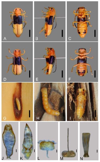 Larvae (Figure 2H): cylindrical, segmented, elongated, light to dark orange, sparsely covered with fine hairs, without legs. Head with a large pair of heavily sclerotized, black mandibles. Larvae up to 50 mm in length, head capsule up to 5 mm in width.