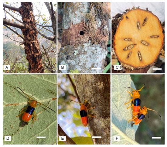 In 2019 and 2020, field surveys were conducted every month in Son La and Yen Bai provinces to determine the number of eggs laid per female, the egg incubation period, the developmental period of larvae, pupa, and adults, and adult longevity. After emergence, each adult was released into a netted cage (0.8 × 0.8 × 1.2 m) containing a one-year-old D. indica seedling (65–88 cm height) to record beetle longevity. The rearing cages were kept in a laboratory at 28–32 °C and relative humidity of 75–85%. In addition, further observations were undertaken to characterize the internal symptoms of the damaged stems/branches, such as feeding patterns, the location of larvae and pupae, and the distribution of cavities under the bark and in wood. The larval and pupal locations were determined by splitting open the infested trees from which wooden slivers and excreta were visible. The behavior of adults, including mating, feeding, time of emergence, and dispersal, was investigated daily.