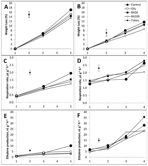 Physiological parameters (weight loss, respiration rate, and ethylene production) were differently affected by the treatments to which were apricots subjected (Figure 1). Significant impact on weight loss at the end of shelf life was observed only between the control and BA100-treated fruits (Figure 1A,B).