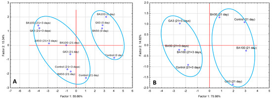 The mentioned changes caused by PGR application, according to PCA analysis, are tentatively assigned as Factor 2, which could explain only 15.34% and 14.82% of variability, respectively (Figure 2A,B). Such small percentages coupled with relatively close proximity of samples after cold storage and shelf life pointed out a small impact, and thereby the overall small difference caused by the application of PGRs.