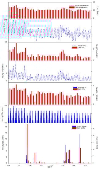 Trend of hourly and daily temperature (T), vapor pressure deficit (VPD), reference evapotranspiration (ET0) and rainfall, during the experiment period (from 224 to 276 days of the year (DOY), obtained by MeteoSense 4.0 weather station.