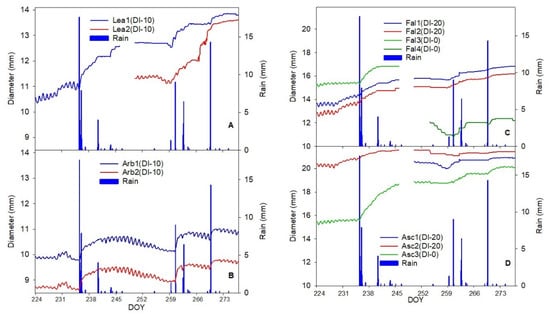 Continuous measurements of diameter of olive fruits during the experiment period (from 224 to 276 days of the year (DOY): (A) fruit 1 and 2 of “Lea” at 10% deficit irrigation (Lea1(DI-10) and Lea2(DI-10), respectively); (B) fruit 1 and 2 of “Arbequina” at 10% deficit irrigation (Arb1(DI-10) and Arb2(DI-10), respectively); (C) fruit 1 and 2 of “Piantone di Falerone” at 20% deficit irrigation (Fal1(DI-20) and Fal2(DI-20), respectively) and fruit 3 and 4 of non-irrigated “Piantone di Falerone” (Fal3(DI-0) and Fal4(DI-0), respectively); (D) fruit 1 and 2 of “Ascolana dura” at 20% deficit irrigation (Asc1(DI-20) and Asc2(DI-20), respectively) and fruit 3 of non-irrigated “Ascolana dura” (Asc3(DI-0)). Missing data From 224 to 249 day of the year (DOY) for Lea2 (DI-10) and Asc1 (DI-20) and from 246 to 249 day of the year (DOY) for panel (A,C,D).