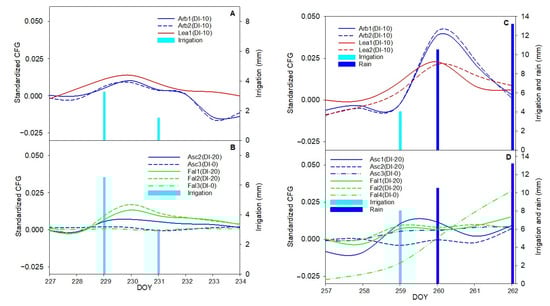 Standardized cumulative fruit growth (CFG). From 227 to 234 day of the year (DOY) (in correspondence with first and second irrigation days) for the olive cultivar Arbequina and Lea (A) and for the olive cultivars Ascolana dura and Piantone di Falerone (B). From 257 to 262 day of the year (DOY) (in correspondence with third irrigation day) for the olive cultivar Arbequina and Lea (C) and for the olive cultivars Ascolana dura and Piantone di Falerone (D). Arb1(DI-10) and Arb2(DI-10) represent fruit 1 and 2 of “Arbequina” at 10% deficit irrigation, respectively. Lea1(DI-10) and Lea2(DI-10) represent fruit 1 and 2 of “Lea” at 10% deficit irrigation, respectively. Asc1(DI-20) and Asc2(DI-20) represent fruit 1 and 2 of “Ascolana dura” at 20% deficit irrigation, respectively. Asc3(DI-0) represents fruit 3 of non-irrigated “Ascolana dura”. Fal1(DI-20) and Fal2(DI-20) represent fruit 1 and 2 of “Piantone di Falerone” at 20% deficit irrigation, respectively. Fal3(DI-0) and Fal4(DI-0) represent fruit 3 and 4 of non-irrigated “Piantone di Falerone”, respectively.