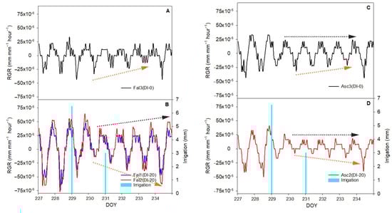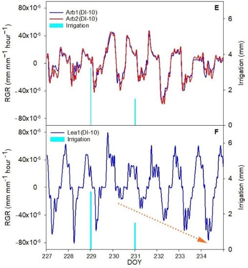 On the other hand, the decreasing minimum of RGR after the first and second irrigation event (orange dashed line in Figure 4B,D–F) confirmed the positive effect of water flow too. Minimum RGR in different cultivars downsized with various slopes which suggested a very different response of cultivars to dehydration. Similar results were previously explained for two Sicilian olive cultivars of Nocellara del Belice and Olivo di Mandanici []. On the contrary, minimum RGR for Ascolana dura (DI-0) and Piantone di Falerone (DI-0) increased (orange dashed line in Figure 4A,C). It could be hypothesized that with positive changes in the environmental condition (here was significant reduction of daily average of VPD from 3 (kPa) in DOY 228 to 1.14, 1.17, 1.34, 1.44 and 1.38 (kPa) in the days after, respectively), the minimum RGR increased.