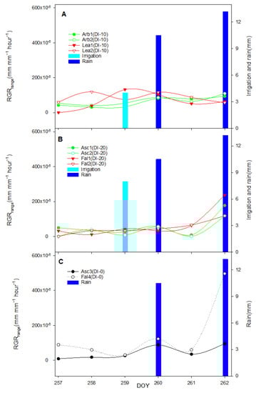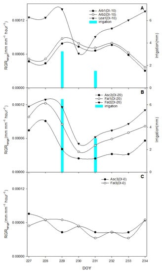 Relative growth rate range (RGRrange) from 227 to 234 day of the year (DOY) (in correspondence with first and second irrigation days: (A) fruit 1 and 2 of “Arbequina” at 10% deficit irrigation (Arb1(DI-10) and Arb2(DI-10), respectively) and fruit 1 of “Lea” at 10% deficit irrigation (Lea1(DI-10)); (B) fruit 1 and 2 of “Piantone di Falerone” at 20% deficit irrigation (Fal1(DI-20) and Fal2(DI-20), respectively) and fruit 2 of “Ascolana dura” at 20% deficit irrigation (Asc2(DI-20)); (C) fruit 3 of non-irrigated “Ascolana dura” (Asc3(DI-0)) and fruit 3 of non-irrigated “Piantone di Falerone” (Fal3(DI-0)).