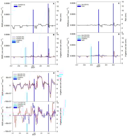 Daily fruit relative growth rate (RGR) from 257 to 262 day of the year (DOY) (in correspondence with the third irrigation day). The olive cultivar Piantone di Falerone (A,B); the olive cultivar Ascolana dura (C,D); the olive cultivar Arbequina (E); the olive cultivar Lea (F). Fal4(DI-0) represents fruit 4 of non-irrigated “Piantone di Falerone”. Fal1(DI-20) and Fal2(DI-20) represent fruit 1 and 2 of “Piantone di Falerone” at 20% deficit irrigation, respectively. Asc3(DI-0) represents fruit 3 of non-irrigated “Ascolana dura”. Asc1(DI-20) and Asc2(DI-20) represent fruit 1 and 2 of “Ascolana dura” at 20% deficit irrigation, respectively. Arb1(DI-10) and Arb2(DI-10) represent fruit 1 and 2 of “Arbequina” at 10% deficit irrigation, respectively. Lea1(DI-10) and Lea2(DI-10) represent fruit 1 and 2 of “Lea” at 10% deficit irrigation, respectively.