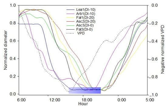 The hysteresis phenomenon is an indirect response of vegetation to diurnal changes in the external environment and the time lag is a major characteristic of hysteresis []. In our case hysteresis is formed by the time lag between VPD and fruit growth. To better capture the time lag between daily diameter and VPD, the normalized data of diameter and VPD have been used. The blue box showed a time lag between some example fruits diameter and VPD (Figure 8).