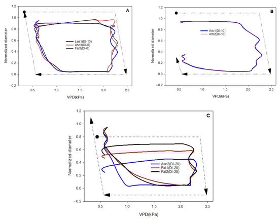 Hysteresis loops of diameter versus vapor pressure deficit (VPD) in one example day (232 day of the year (DOY)). (A) Complete clockwise hysteresis; (B) incomplete clockwise hysteresis; (C) partial clockwise hysteresis. Dotted black line shows the rotational pattern and starting and ending point of hysteresis loops. Arb1(DI-10) and Arb2(DI-10) represent fruit 1 and 2 of “Arbequina” at 10% deficit irrigation, respectively. Lea1(DI-10) represents fruit 1 of “Lea” at 10% deficit irrigation. Asc2(DI-20) represents fruit 2 of “Ascolana dura” at 20% deficit irrigation. Asc3(DI-0) represents fruit 3 of non-irrigated “Ascolana dura”. Fal1(DI-20) and Fal2(DI-20) represent fruit 1 and 2 of “Piantone di Falerone” at 20% deficit irrigation, respectively. Fal3(DI-0) represents fruit 3 of non-irrigated “Piantone di Falerone”.