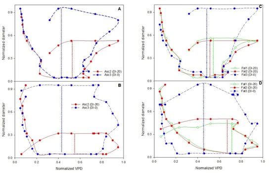 Hysteresis loops of diameter versus vapor pressure deficit (VPD) in first (229 day of the year (DOY)) and second (231 day of the year (DOY)) irrigation days. (A) 229 day of the year (DOY) for Ascolana dura; (B) 231 day of the year (DOY) for Ascolana dura; (C) 229 day of the year (DOY) for Piantone di Falerone; (D) 231 day of the year (DOY) for Piantone di Falerone. Asc2(DI-20) represents fruit 2 of “Ascolana dura” at 20% deficit irrigation. Asc3(DI-0) represents fruit 3 of non-irrigated “Ascolana dura”. Fal1(DI-20) and Fal2(DI-20) represent fruit 1 and 2 of “Piantone di Falerone” at 20% deficit irrigation, respectively. Fal3(DI-0) represents fruit3 of non-irrigated “Piantone di Falerone”. Dotted lines show the height of hysteresis curves.
