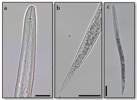 - Eisenback, J.D. Detailed morphology and anatomy of second-stage juveniles, males, and females of the genus Meloidogyne (root-knot nematodes). In An Advanced Treatise on Meloidogyne; Sasser, J.N., Carter, C.C., Eds.; State University Graphics Raleigh: Raleigh, NC, USA, 1985; Volume I, pp. 47–77. [Google Scholar]