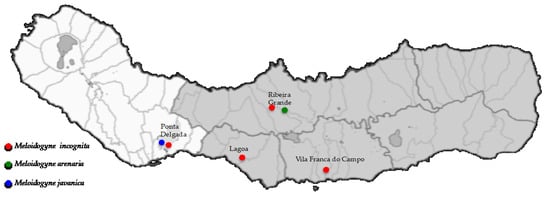 - Rusinque, L.; Nóbrega, F.; Cordeiro, L.; Serra, C.; Inácio, M.L. First Detection of Meloidogyne luci (Nematoda: Meloidogynidae) Parasitizing Potato in the Azores, Portugal. Plants 2021, 10, 99. [Google Scholar] [CrossRef] [PubMed]