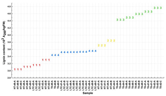 To get a more convincing 2-cluster pattern, the k-means method was used for the initial cluster. Setting the k parameter as 4, 48 loquat samples were randomly combined and clustered into four groups based on the lignin content (Figure 3). Then these clustered groups were randomly combined into seven 2-classes: ((1), (2, 3, 4)), ((2), (1, 3, 4)), ((3), (1, 2, 4)), ((4), (1, 2, 3)), ((1, 2), (3, 4)), ((1, 3), (2, 4)) and ((1, 4), (2, 3)). For further correlation coefficient calculations, the lignin content value was replaced by the discrete variable 1 or 2 in each 2-class. For example, in ((1), (2, 3, 4)), the lignin content value was substituted as 1 in (1) and 2 in (2, 3, 4).