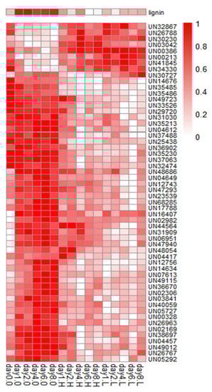 The expression of other transcription factors was also identified as being correlated with lignin content, including ERF (UN41017), BHLH (UN35332), MYB (UN31768, UN02037), WRKY (UN10110 and UN23662), NAC (UN48890) and so on (Table S1).