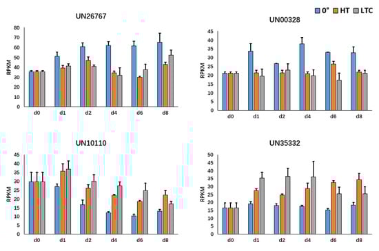The RPKM of UN26767, UN00328, WRKY (UN10110) and BHLH (UN35332) at each time point under LTC, HT and 0 °C treatments from the RNA-Seq analysis of loquat fruit.