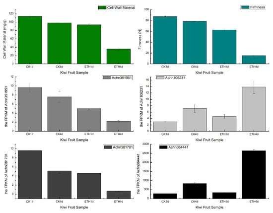 The cell wall material content (mg/g), firmness (N) and FPKM value of four new candidate genes (Achn351951, Achn106231, Achn381701 and Achn064441) detected by C-CorA in four groups of kiwi fruit.