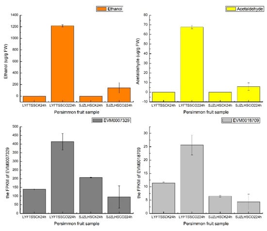 The ethanol production (μg/g FW) and acetaldehyde production (μg/g FW) of four persimmon fruit groups, along with the FPKM value of the two newly detected genes (EVM0007329 and EVM0018709) detected by C-CorA.
