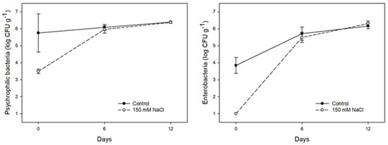 Psychrophilic bacteria and enterobacteria (log CFU g−1) of C. maritimum leaves with different salinity treatment (control and 150 mM NaCl) after storage at 5 °C for 0, 6 and 12 days. Values are the mean ± SE (n = 3).