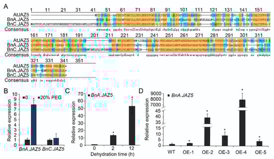 3.1. Expression Patterns of JA Signaling Regulator BnA.JAZ5 Revealed Its Potential Function in Rapeseed Response to Drought Stress