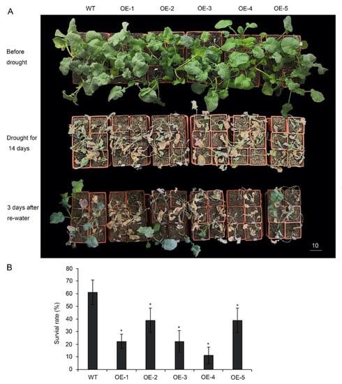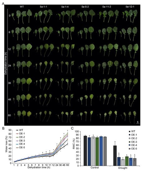 3.2. Overexpression of BnA.JAZ5 Reduced Drought Tolerance