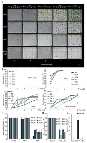 - Pan, J.; Hu, Y.; Wang, H.; Guo, Q.; Chen, Y.; Howe, G.A.; Yu, D. Molecular mechanism underlying the synergetic effect of jasmonate on abscisic acid signaling during seed germination in Arabidopsis. Plant Cell 2020, 32, 3846–3865. [Google Scholar] [CrossRef] [PubMed]