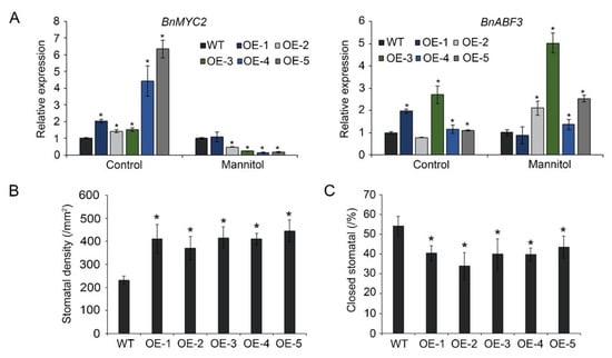 3.5. BnA.JAZ5 Overexpression Increased Stomatal Density and Reduced Stomatal Closure