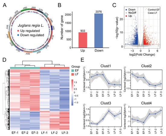3.2. Identification and Enrichment Analysis of DEGs between EF and LF Walnut Varieties