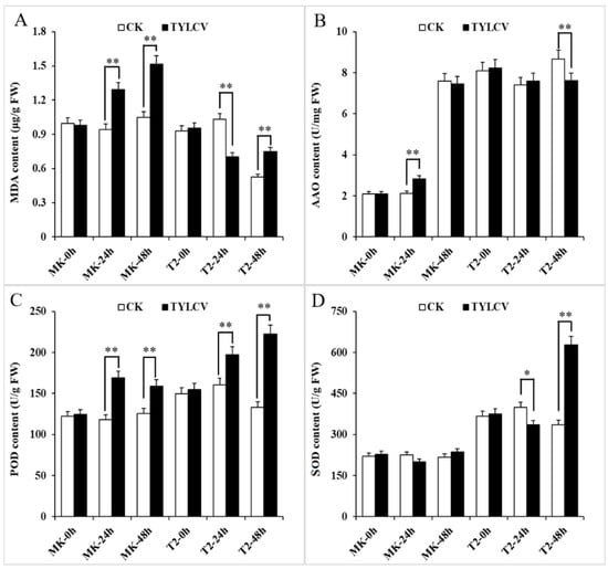 The MDA content and activity of reactive oxygen species (ROS)-scavenging enzymes in TYLCV-infected plant leaves. (A) The MDA content in treated plants. (B–D) The activities of ascorbate oxidase (AAO), peroxidase (POD), and superoxide dismutase (SOD) in treated plants, respectively. The data represent the mean ± SD (n = 3). Data were analyzed by an ANOVA in the SPSS software. * (p < 0.05) and ** (p < 0.01) indicate statistically significant differences.
