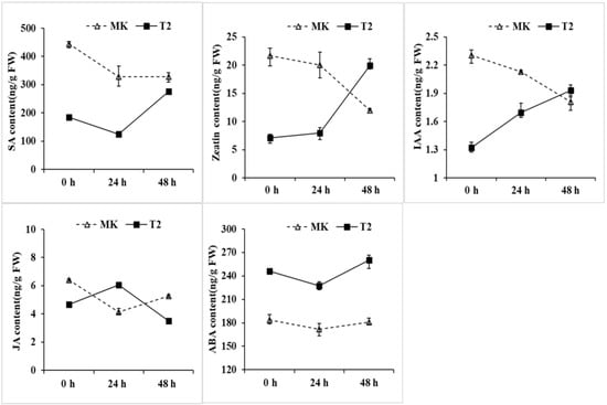 Plant hormones are a key part of plant–pathogen interactions. Exogenous application of salicylic acid (SA) can inhibit virus accumulation and improve the resistance of susceptible cultivars. Furthermore, the blocking of SA signaling results in more detectable TYLCV in tomatoes [,]. Jasmonic acid (JA) can regulate the biosynthesis of phytoalexin to avoid the virus transmitting from the vector to the plant []. The virulence factor βC1 of TYLCV directly interacts with MYC2, the fundamental transcription factor in JA signaling, and compromises its transcription activation, resulting in the suppression of terpene biosynthesis and subverting plant resistance []. To date, researchers have mainly focused on gene expression and function with samples after a long period of infection in TYLCV and tomato interaction [,,]. To investigate the differential expression genes induced by TYLCV in a short time, we carried out RNA-seq with Moneymaker (MK; a susceptible line) and CLN2777A (T2; a resistant line) infecting them with virus after 24 and 48 h. Meanwhile, the activity of reactive oxygen species (ROS)-related enzymes and plant hormones was detected to uncover the mechanism of TYLCV resistance in tomatoes.