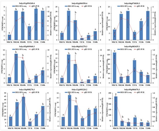 Verification of nine randomly selected DEGs by qRT-PCR. Comparison of RNA-seq data (blue bar) with qRT-PCR data (red line). The normalized expression level (FPKM) of RNA-seq is indicated on the Y-axis to the left, and the relative qRT-PCR expression level is shown on the Y-axis to the right. α-Tubulin (Solyc04g077020.2) was used as the internal control. Both methods show similar gene expression trends. Three biological replicates were performed. Data were analyzed by an ANOVA in the SPSS software, and a, b, c, and d indicate statistically significant differences (p < 0.05) for the designated time point.