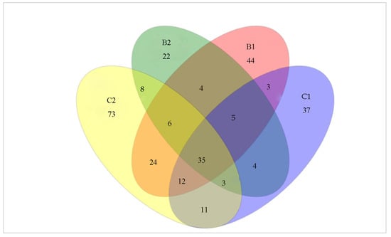 A Venn diagram of shared and unique OTUs of epiphytic bacterial communities of lettuce plants grown in Bacillus probiotic treated and control systems. B1 and B2 represent leaf samples obtained from Bacillus probiotic supplemented systems and C1 and C2 represent leaf samples from the control systems.