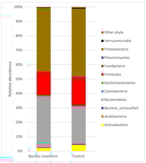 The relative abundances of taxa (at the phylum level) of leaf epiphytic bacteria from lettuce plants obtained from Bacillus probiotic treated and control aquaponic systems. Phyla less than 0.2% of the total reads are displayed under “other phyla” and include the phyla Armatimonadetes, Chloroflexi, Chlamydiae, Dependentiae, Nitrospirae, Patescibacteria, and Spirochaetes.