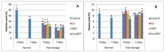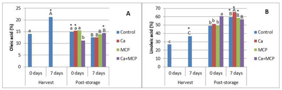 The percentage of oleic acid, an important mono-unsaturated fatty acid, increased significantly during the shelf-life after harvest, but it is important to notice that after cold storage, there was a reduction in Ca + MCP-treated fruits, which recovered during the posterior shelf-life as stearic acid did (Figure 2A). The linoleic acid content, an essential poly-unsaturated fatty acid (PUFA), increased after 7 days of shelf-life after harvest (Figure 2B). After cold storage, the content of linoleic acid continued to increase; the Ca + MCP-treated fruits had higher values than the other treatments. After the shelf-life poststorage, the percentage of linoleic acid continued to increase except for Ca + MCP.