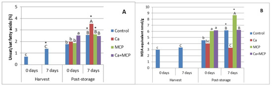 After 6 months of cold storage, MCP- and MCP+Ca-treated apples showed a higher MDA content than the other treatments. Interestingly, after 7 more days of shelf-life, the control and MCP treatments continued to increase, resulting in MCP-treated apples having the highest values and the Ca-treated apples having the lowest. After shelf-life post storage, it seems that in fruits treated with 1-MCP (MCP) or not (control), when calcium was added (Ca) or (Ca + MCP) there was an effect of reducing MDA. Additionally, as observed after the 6 months of cold storage, it seems that when MCP treatment was included (MCP and Ca + MCP), MDA increased, suggesting a temperature-dependent effect. Further research is needed to understand this point. Moreover, lower temperatures promote lipid oxidation, affecting the structural integrity of the plant membrane cells [12]. Interestingly, the higher value of unsaturated/saturated fatty acids obtained after storage plus shelf-life in Ca-treated apples was coincident with the lowest MDA value (Figure 3B), which may reveal a positive effect of Ca on reducing lipid peroxidation.