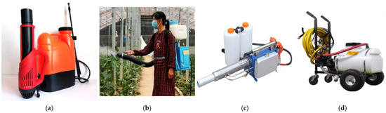 Pesticide application in greenhouses is limited by the closed conditions and operating spaces. Therefore, the application of pesticides in greenhouses predominantly uses knapsack sprayers, knapsack mist sprayers, fogger sprayers, and spray guns or lances connected to a spraying trolley (Figure 1) because they are not restrained by planting patterns and space [21].