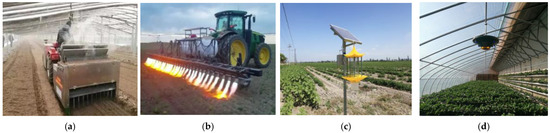 Major types of physical control: (a) soil steam sterilizer, (b) flame weeding, (c) solar insect killing lamp, and (d) ozone generator.