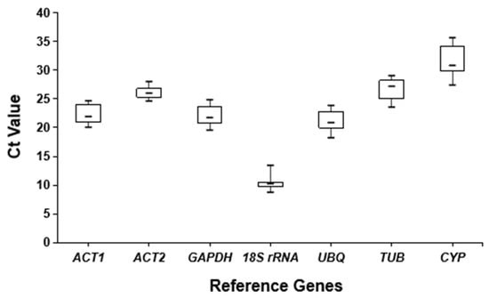 The ideal Ct value for the reference gene should be in the range of 15–30 [], with either too high or too low a Ct value being highly likely to result in less accurate quantitative results. Therefore, when selecting reference genes, in addition to considering gene expression stability, it is important to ensure that gene expression abundance is maintained at a moderate level. In this study, 18S rRNA and CYP were stably expressed in seven different varieties of kiwifruit, but the expression of 18S rRNA was high and CYP low (Figure 1), both of which were outside the range of Ct values for ideal reference genes and unsuitable for use as reference genes. Further research is needed on the applicability of low (high) level expression of the reference genes.